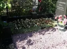 Очередная ежемесячная уборка на могиле. За прошедшее время с последней уборки были дожди. Растения стили гуще, сорняки тоже. Пыли на граните тоже не мало, особенно со стороны дороги.