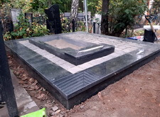 Когда подготовительные работы на территории могилы были завершены, мы принялись за укладку брусчатки на пескобетон, сама плитка была уложена вровень с облицованным гранитными плитами цоколем. Параллельно с этим мы подготовили основание для последующей установки надгробья.