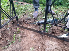 Далее мы перешли к следующему подготовительному этапу, который необходимо осуществить перед укладкой наземного покрытия: создание надёжного периметра из металлических полос. Его приварили с углам ограждения, опять-таки сверившись с уровнем.